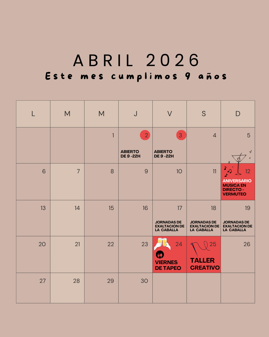Cada mes elaboramos un calendario de eventos (en nuestras redes, en el corcho y ahora en la web) con las actividades que creamos nosotras mismas "Viernes de Tapeo", "Música en directo", "Talleres creativos" o las campañas en las que participamos como parte de ACISA: Ribadeo de Tapeo, Jornadas de Gastronomía de Asturias en Galicia, Cantos de Taberna, etc.